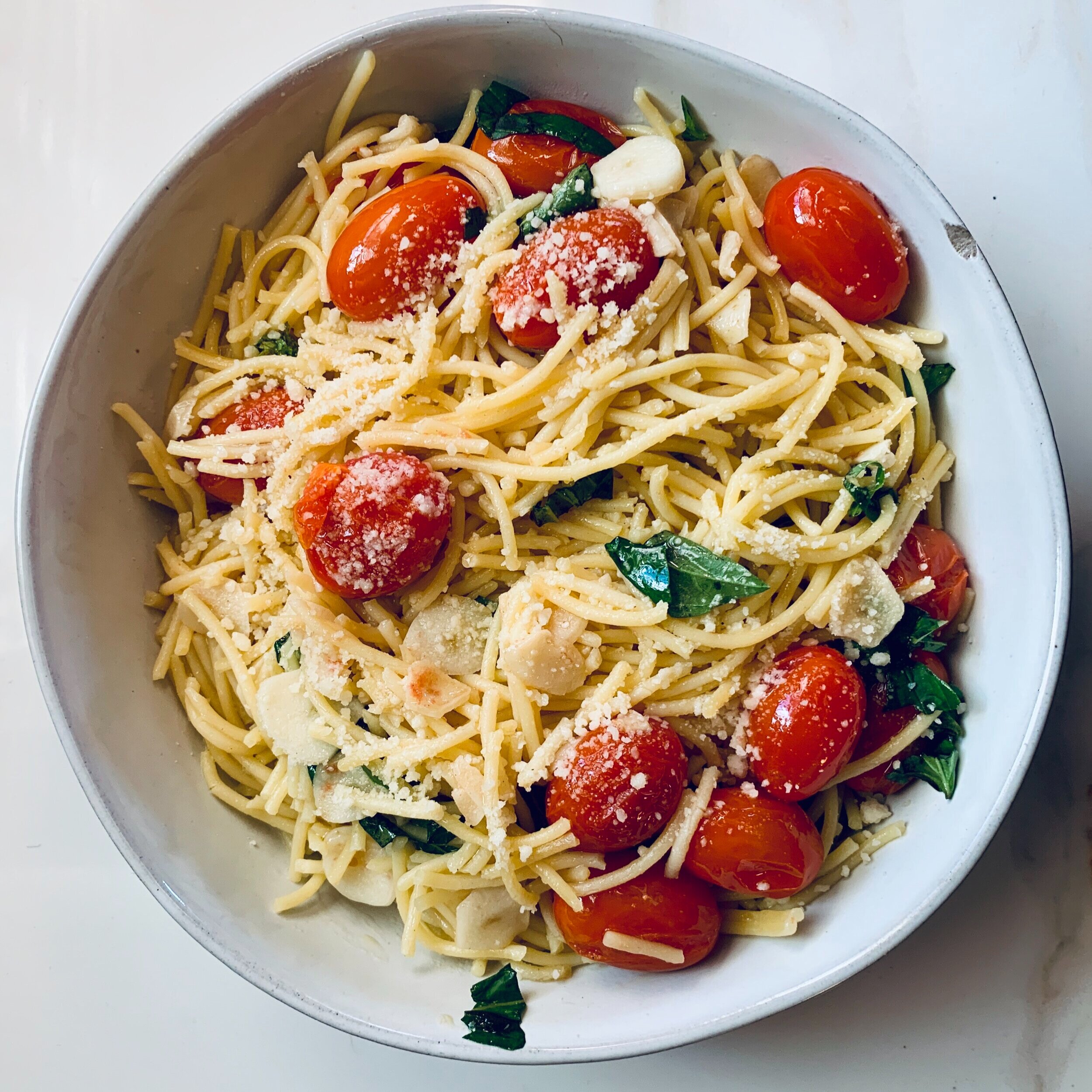 Cook pasta according to directions, saving 1/4 cup of the cooking water. Heat a pan to medium low and add olive oil, garlic and cherry tomatoes, salt and let cook slowly about 7-10 minutes, until the cherry tomatoes begin to burst a bit. Stir in the pasta and pasta water, add basil. Portion into two bowls and serve with parmesan